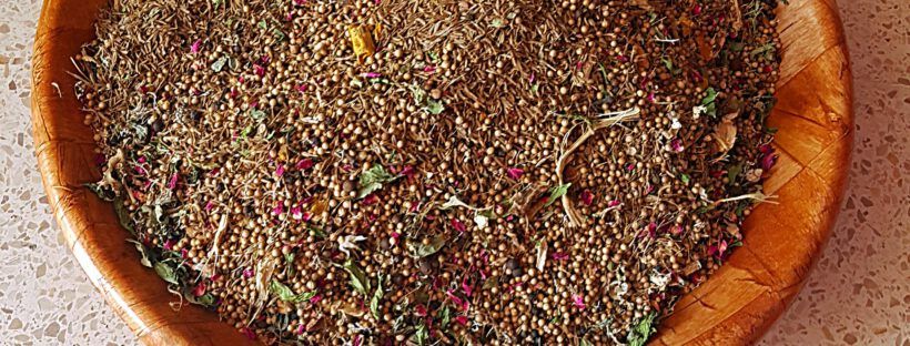 Fertig ist die Ras el Hanout Mischung. Jetzt geht es in die Mühle. Das fertige Gewürz hält gut verschlossen und dunkel gelagert über ein Jahr: Das sollte es auch, denn obwohl es fast täglich verwendet wird (1-2 TL täglich im Durchschnitt für ein Essen für 4 Personen) sind 3 kg doch eine ganze Menge. Zum Rezept für Täbel, das manche anstelle von Ras el Hanout verwenden, geht es hier.
