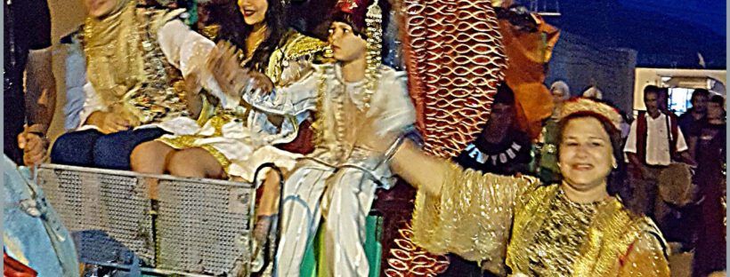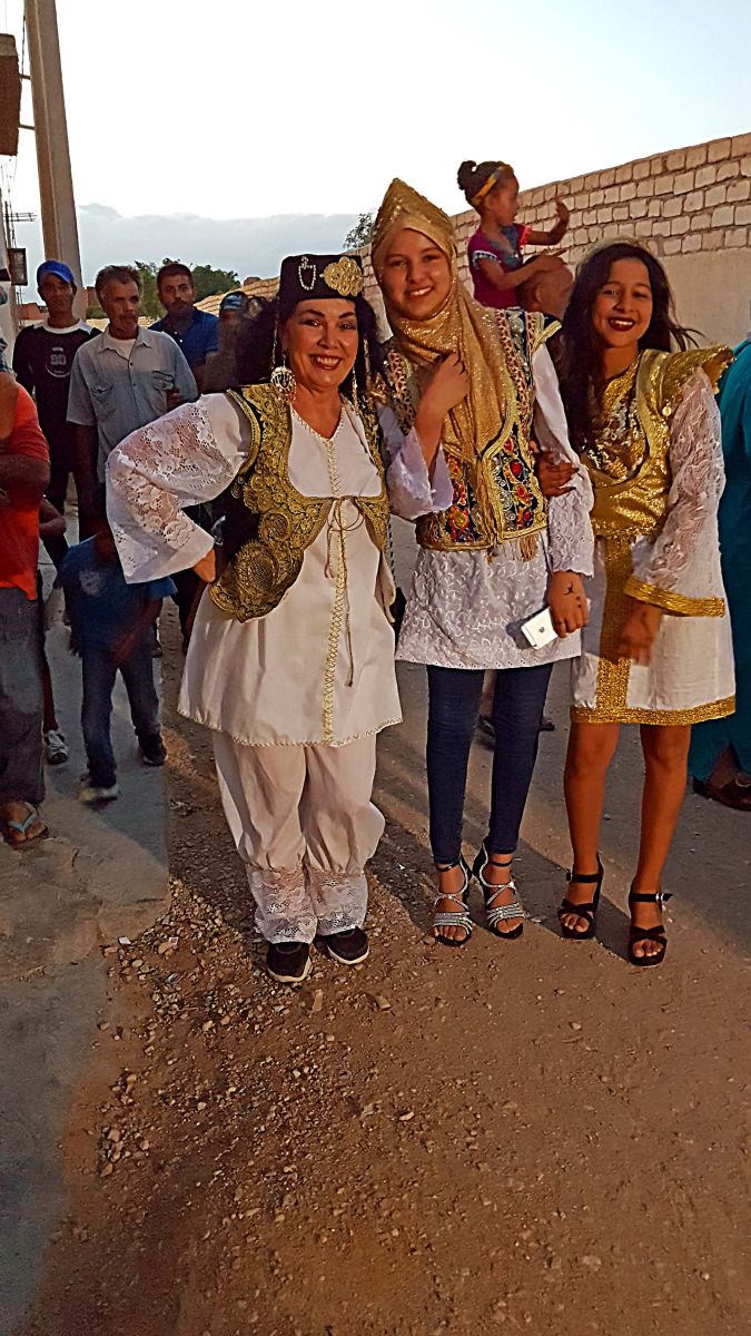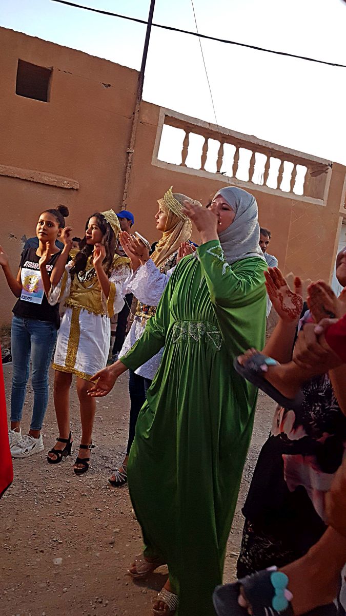 Zum Glück hat die Oma gekocht, sonst hat grad niemand Zeit. Um 13h gehts mit fünf Frauen und drei Kindern ins Hamam. Allah sein Dank, dass wir einen Temperaturabfall von über 10° Grad haben. Von 42° auf 31°. Zwar ist es dafür schwüler, und nach dem Hamam ist man schnell wieder genauso nass wie drinnen, aber die ganze „Äkschon“ bei über 40° ist nur für Hardliner, die die Hitze gewohnt sind. Im Sommer hält mich auch nichts lange im Hamam, nach einer guten Stunde gehe ich mit dem Knaben als erste nach Hause; er ist eigentlich schon zu groß fürs Frauenhamam; obwohl erst 6 Jahre, sieht er aus wie 8 und hat Schuhgröße 35. Daher mußte sich die Mutter in der Duschkabine mit ihm einschließen und ihn dort schrubben. Zu Hause endlich ein bißchen chillen. Aber nur bis 18h. Dann müssen wir zu den Kostümverleiherinnen.Sie sind am anderen Ende vom Ort und wir gehen zu Fuß, das sind mindestens 20 Minuten. Nur in einem Laden gibt es einen Ventilator…..nirgends Klimaanlage…..und bis fünf Frauen das passende gefunden haben….! Zum Glück hab ich immer meinen Tanzfächer dabei 🙂