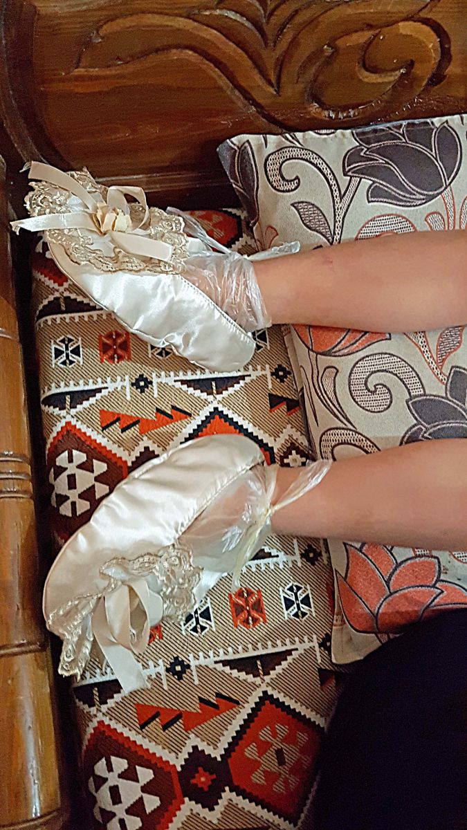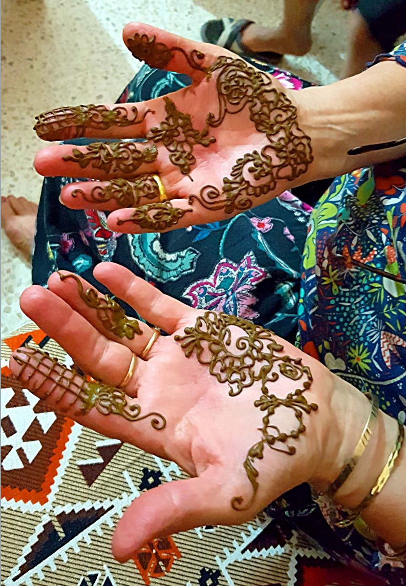 Erst um 20.30h sind wir zurück und jetzt trifft die Henneiya ein, die Hennafrau. Zuerst kommt der Knabe dran. Er muß dann eine gute Stunde mit eingetüteten Füßen und Händen, auf denen seidene Handschuhe und Slipper stecken, ruhig liegen. Die Kerze, die jetzt brennen sollte, ist leider irreparabel abgebrochen. Dafür wird getrommelt und geträllert. Er läßt das alles so über sich ergehen; vielleicht ist ihm auch ein bißchen mulmig: wozu der ganze Aufwand, wenn es doch nur ein kleiner Schnitt ist und kaum weh tut…..? Nur die Schwester tritzt ihn natürlich damit, dass sie ihm Angst macht und erzählt, wie schlimm es werden wird. (Fakt ist: es wird schlimm!) Die kleine Rache der Frauen, weil ständig die Jungs im Mittelpunkt stehen…. Das Ruhig-liegen ist kein Problem für den Jungen, doch dann muß er Pipi. Er kann/darf weder Füße noch Hände benutzen, doch die Tante ist da ganz praktisch, nimmt eine leere Wasserflasche und läßt ihn im Sitzen reinpinkeln. Als nächste komme ich Hennamäßig an die Reihe und diesmal