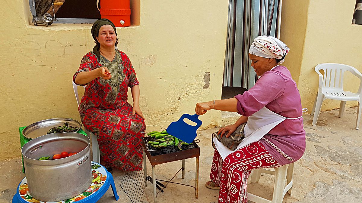 Seit 8h morgens wird gewerkelt, eingekauft (alles per Moped), gekehrt, geschnippelt, geröstet, gekocht, gebacken, gerührt, gehackt, gewischt, gespült….in zwei Küchen. 15 kg Couscous und 25 kg Lammfleisch und entsprechende Mengen an Eiern, Tomaten, Kartoffeln, Paprika, Zwiebeln etc. wollen verarbeitet werden.