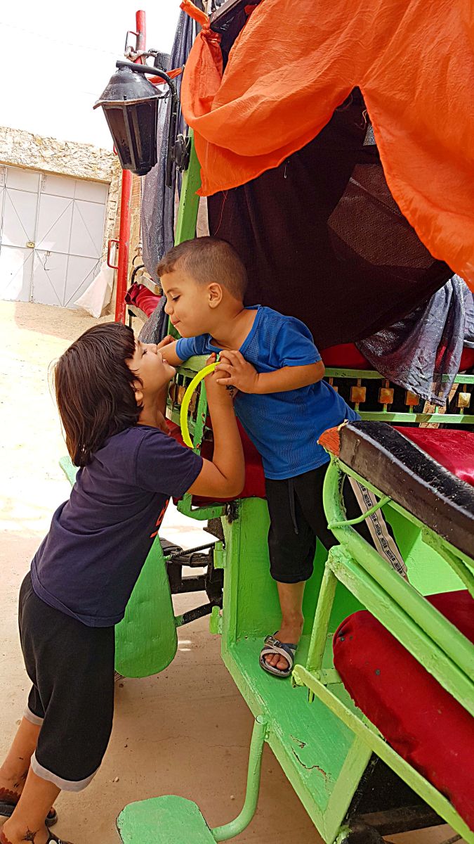 Ich, Anfänger in Sachen derartiger Feste (und auch nicht scharf drauf, jemals Profi zu werden) dachte natürlich: das Kind darf mit seinen Spielkameraden eine Stunde Kutsche fahren oder so. Weit gefehlt: Das Kind darf zwar Kutsche fahren, aber die 50 bis…..200 Gäste laufen mit, inklusive zweier Musiker (T`baar) mit großer Trommel und Zukra. Dafür steht nun bereits die Kutsche (tun. Kalyz, ägypt. Hantour) im Hof, ein herrlicher Spielplatz für alle anwesenden Kinder. Und dafür (und nur dafür !) werden traditionelle Kostüme ausgeliehen bei einer der zahlreichen örtlichen Kostümverleiherinnen.Aber der Reihe nach: Donnerstag soll die Party steigen, doch die ersten Gäste aus der Familie reisen bereits Montag an. D.h. Kuchen backen, kochen, Gästebetten vorbereiten. Am Dienstag der konkurrenzlose Putztag bis etwa 22h mit abendlichen Rückenschmerzen usw. ….Putzen ist einfach ungesund. Ab Mittwoch dann der verschärfte Countdown: Morgens um 7h in den Suq, um die Klamotten für das Knäblein zu besorgen. Wobei ich die einzige bin, die zur verabredeten Zeit parat steht….. Wir fahren um 8.30h. (Ein Schelm, wer Schlechtes dabei denkt: es gibt hier auch pünktliche Leute, manche kommen sogar zu früh!)