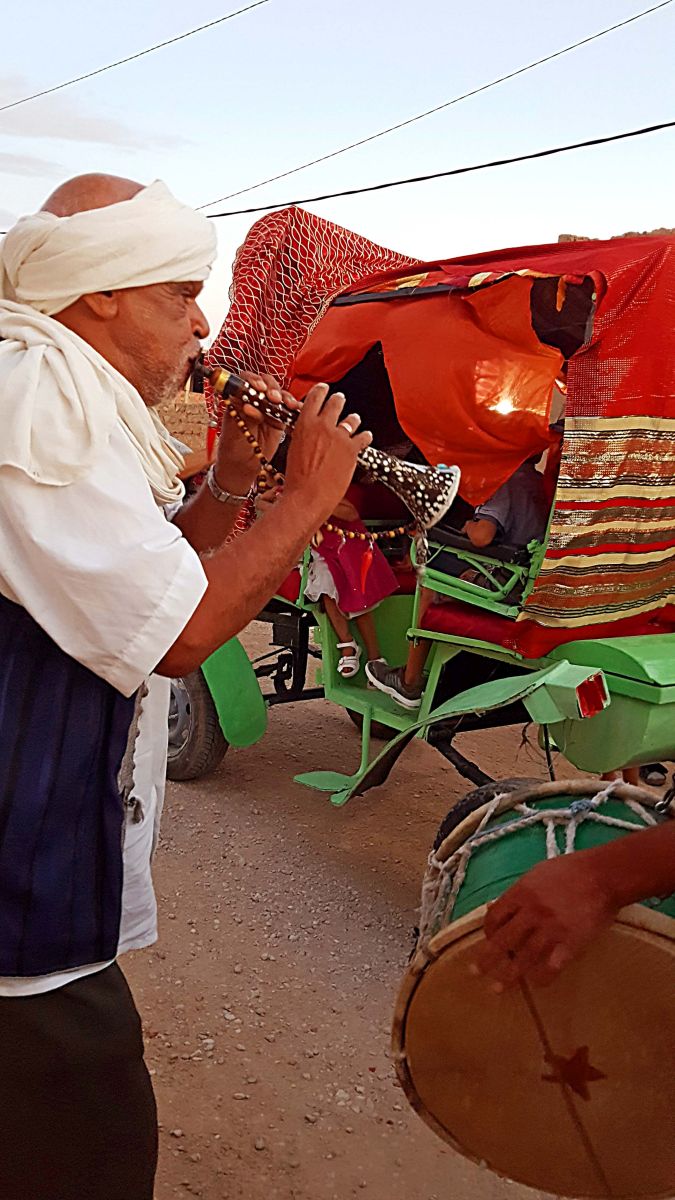 Mit Böllerschüssen, Getrommel auf der T´bol (große Zylindertrommel) und Geflöte (also hier ist keine liebliche Flöte gemeint, sondern ein ohrenbetäubendes reines Freiluftinstrument namens Zukra, eine Oboe, auch unter den Namen Zamr oder Gaita bekannt) und viel Geträllere der Frauen setzt sich der Zug in Bewegung. Draußen stehen schon die Nachbarn, die auch mitlaufen wollen. Neben der Kutsche geht eine Tante, die in ihrer linken Hand einen dicken nassen Lappen, darauf ein Gefäß mit glühender Kohle, hält und in der anderen eine Dose mit einer Räuchermischung trägt.