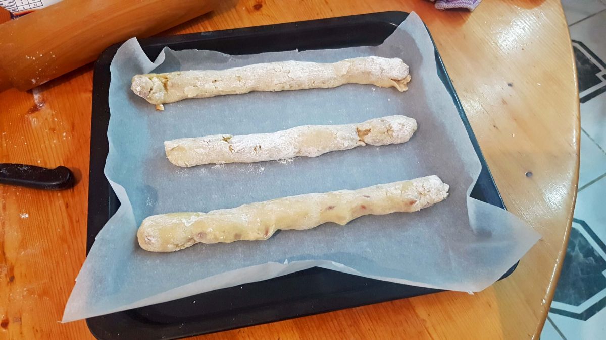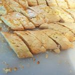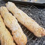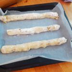 6 Rollen a´25 cm formen. Mit Abstand auf ein mit Backpapier ausgelegtes Blech legen. 15 bis 20 Minuten backen. Auf ein Gitter legen und abkühlen lassen. In schräge Stücke schneiden. Die Stücke mit der Schnittseite nach oben wieder auf das Blech legen und nochmal 10 Minuten backen, bis sie anfangen sich zu bräunen. Auskühlen lassen, in einer Blechdose aufbewahren.