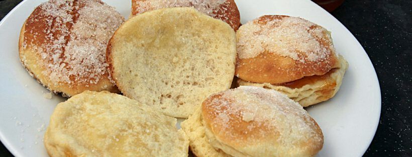 Die französischen Krapfen – die es wie in Deutschland – zum „Carnaval“ gibt, werden zwar meist, aber nicht zwingend in schwimmenden Fett ausgebacken, aber an Fett wird trotzdem nicht gespart: Sie werden dafür reichlich mit Butter bestrichen, vor dem Backen, nach dem Backen und mit ebenso reichlich Zucker bestreut, auch vor und nach dem Backen. Kohlhydrat – und Kalorienmäßig gibt es sich also nix. Die französischen Krapfen machen allerdings weniger Arbeit, weniger Dreck und werden im Ofen gebacken, d.h. es stinkt dann auch nicht nach heißem Fett – und sie lassen sich einfach füllen (nach dem Backen), weil durch das Ausstechen mit dem Glas eine kleine Kerbe entsteht, an der sich nach dem Backen der „Deckel“ fast von selber abnehmen läßt. Sie schmecken aber auch ungefüllt durch den karamellisierten Puderzucker und der Schicht Zucker obendrauf. Allerdings sind sie mit Vanillepuddingcreme ziemlich unwiderstehlich. Durch das Zusammenfalten und wieder Ausrollen bekommen sie schöne Schichten im Teig. „Deutsche Krapfen“ findest Du hier.