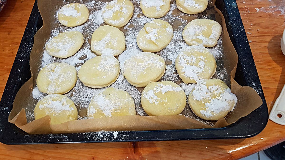Wieder ausrollen, auf ca. 2-3 cm Stärke. Dann mit einem Glas Kreise ausstechen. Mit Butter bepinseln, auf das Backblech mit Backpapier legen, mit Puderzucker bestreuen und nochmal 15 Minuten gehen lassen.