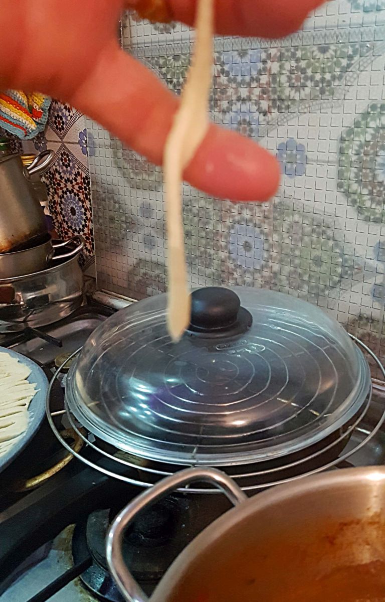 Wenn das Wasser kocht, in der Zwischenzeit aus Mehl oder Grieß, Salz und Wasser einen elastischen Teig kneten, 30 Min im Kühlschrank ruhen lassen. Dann auf einer Platte (Tablett, flacher großer Teller) ausziehen, dass er nur 1/2 cm hoch ist. Mit einem Messer in Streifen schneiden.