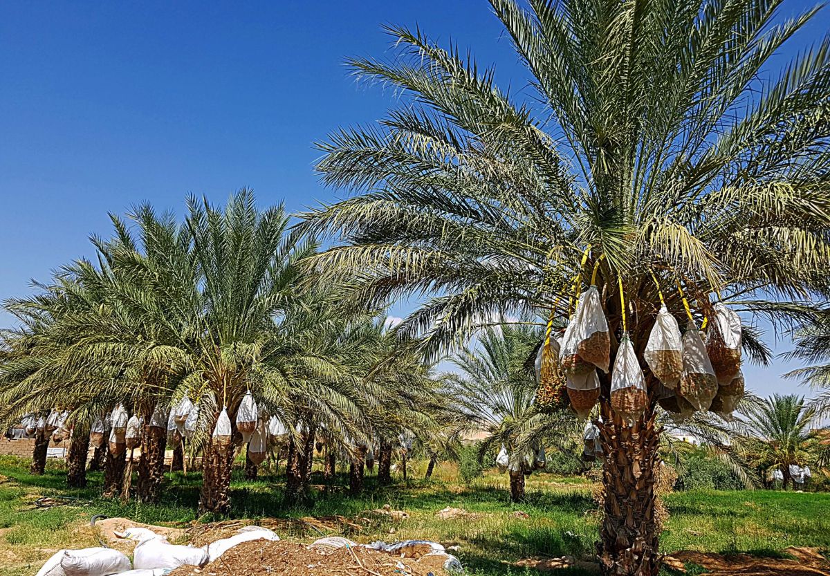 Tja…..Wir haben jetzt auch einige Dattelpalmen bestellt, die wir in dem Acker einpflanzen wollen, wo bisher die Bohnen gesät wurden. Die meisten Dattelpalmen kommen aus Kebili oder Douz. So ein kleines Dattelbäumchen von 1 bis 1,50 Meter kostet etwas über 10 Euro. Und für jeden Baum bekommt man ein Zertifikat, denn natürlich haben wir die besten genommen, die Daglet ennour, die Datteln des Lichts und die sollen nicht über irgendeine Grenze gebracht werden. Diese tollen Datteln sind weich und durchscheinend, daher der Name. Sobald die Früchte ihre endgültige Größe erreicht haben, wird über jede Traube (ca 4-5 Kilo) ein luftiger Sack aus Netzstoff gespannt, damit zum Einen keine Früchte durch Herabfallen verloren gehen und zum Anderen keine Insekten an die leckere Süßigkeit herankommen.