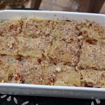 Zwei Blätter auflegen (immer dazwischen buttern), wieder Mandeln, Rosinen und Kokosflocken darüberstreuen, etwas fürs oberste Deckblatt übriglassen. Weitere drei Blätter drauf schichten.
