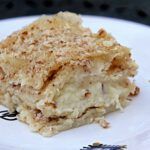 Dann die Hälfte der Mandeln, der Rosinen und der Kokosflocken drauf verteilen. Weitere zwei Blätter auflegen. Den Pudding darüber verteilen.
