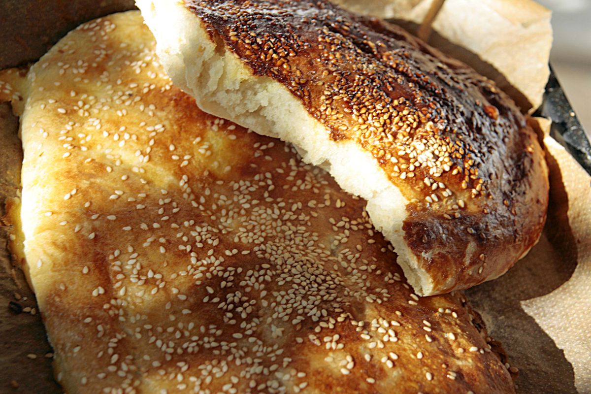 Die Kruste aus Ei, Mehl und Sesam gibt diesem Fladenbrot den speziellen Geschmack: außen knusprig, innen fluffig.