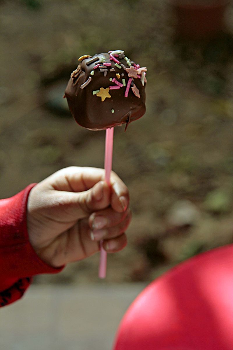 Nun die Kuvertüre schmelzen, die Kugeln auf die Cake Pop-Sticks stecken und in die warme Kuvertüre stecken.