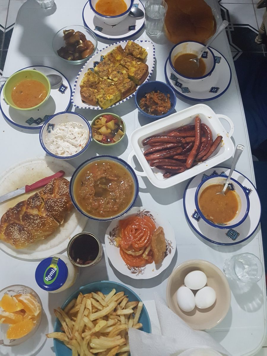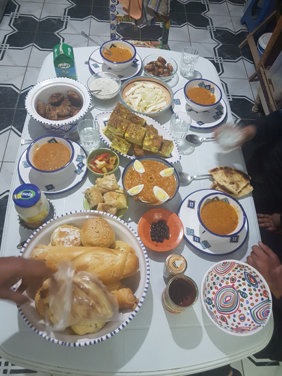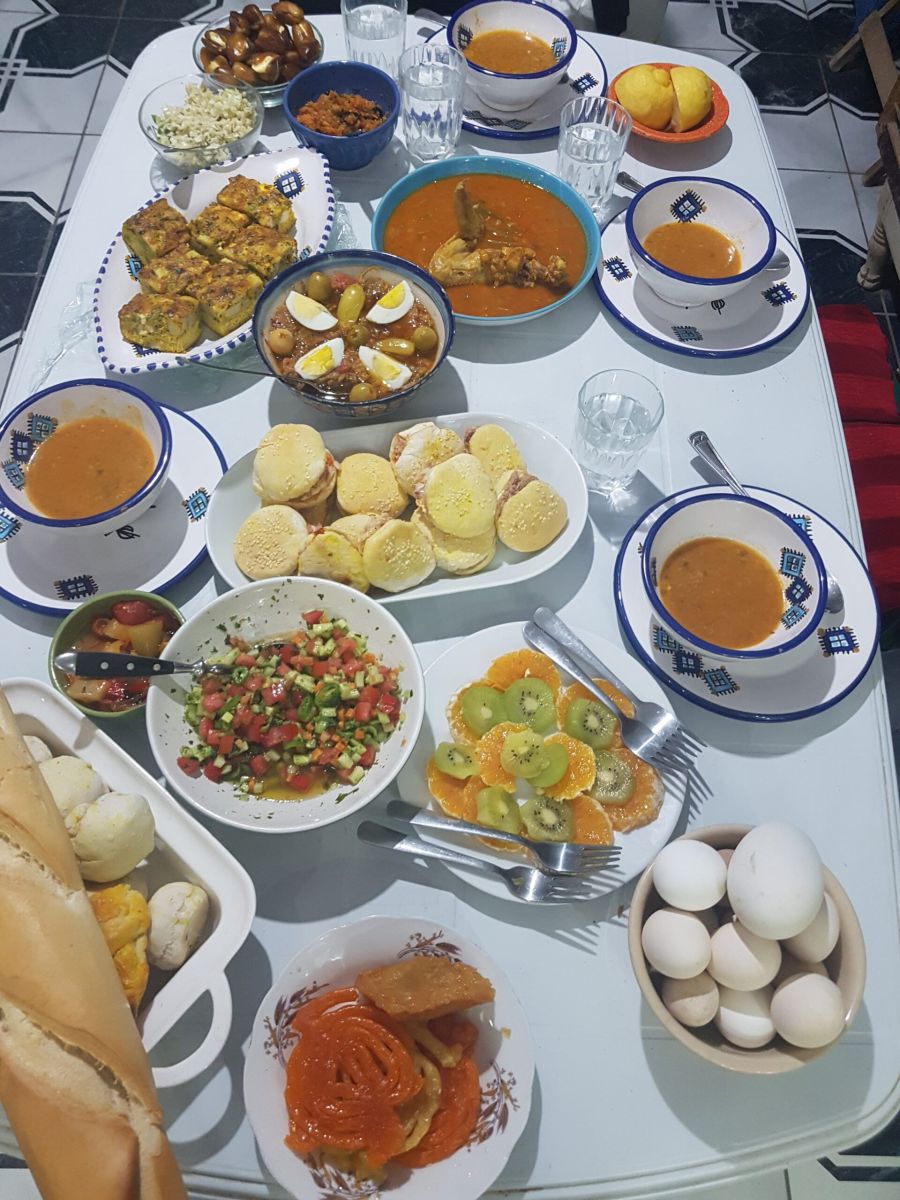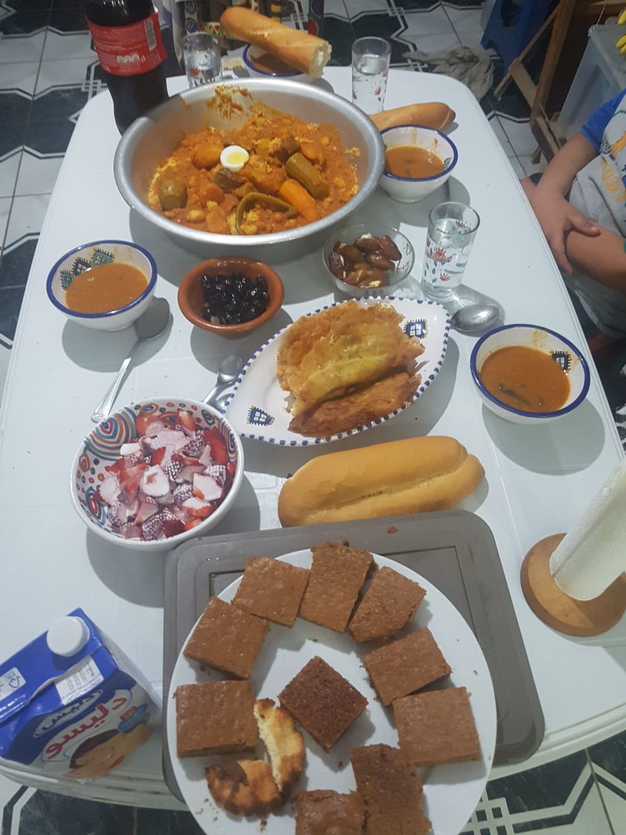 Letzter Tag: gefüllte Datteln, Tschischa, Marga mit Mangold, Nudeln, Mlaoui, Khobz al Dar (algerisches Hausbrot), Fenschel, Orangen, Erdbeeren mit Schokopudding, Reste.