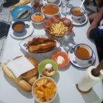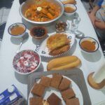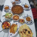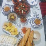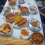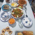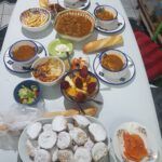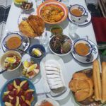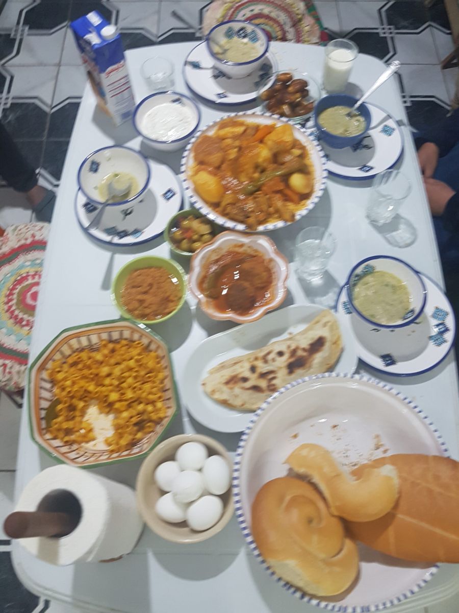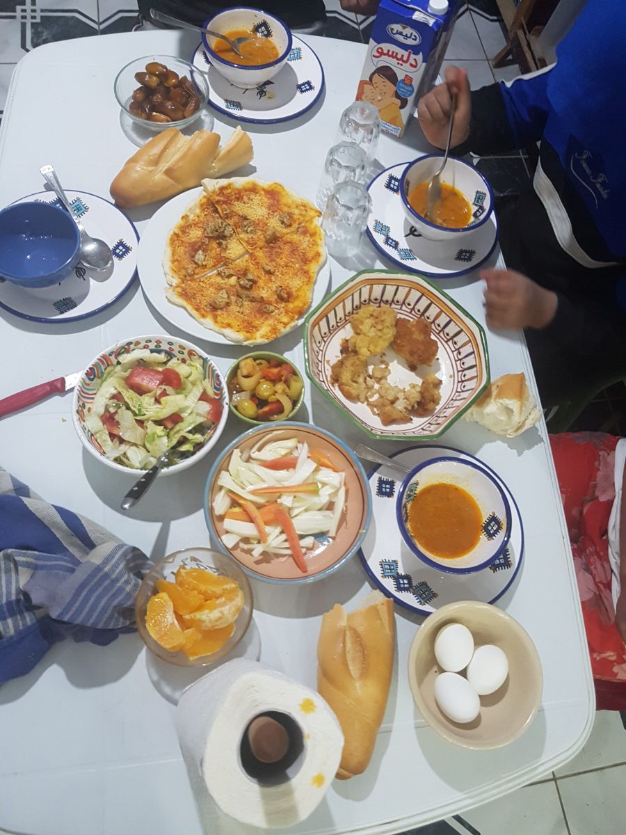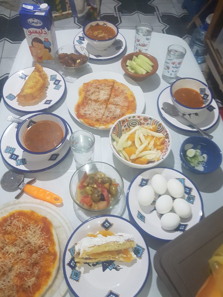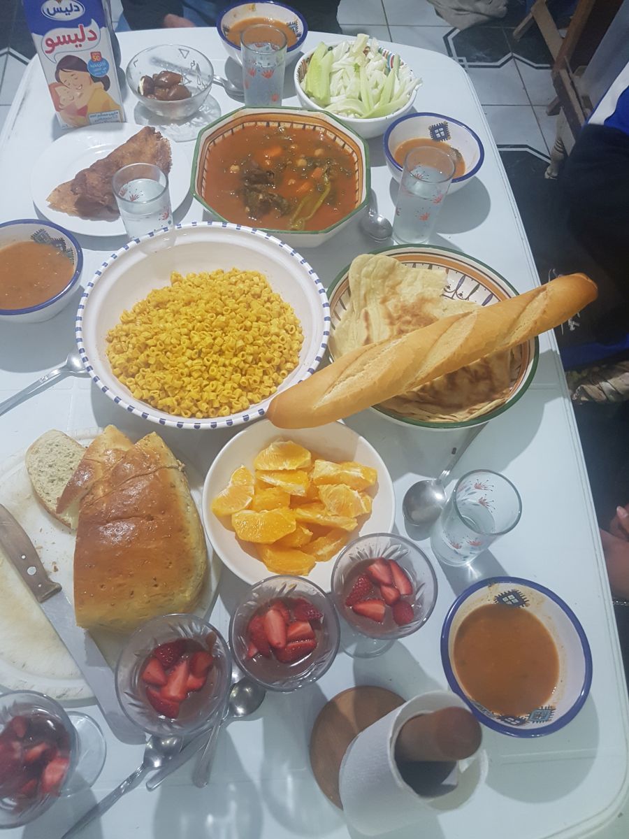 Letzter Tag: gefüllte Datteln, Tschischa, Marga mit Mangold, Nudeln, Mlaoui, Khobz al Dar (algerisches Hausbrot), Fenschel, Orangen, Erdbeeren mit Schokopudding, Reste.