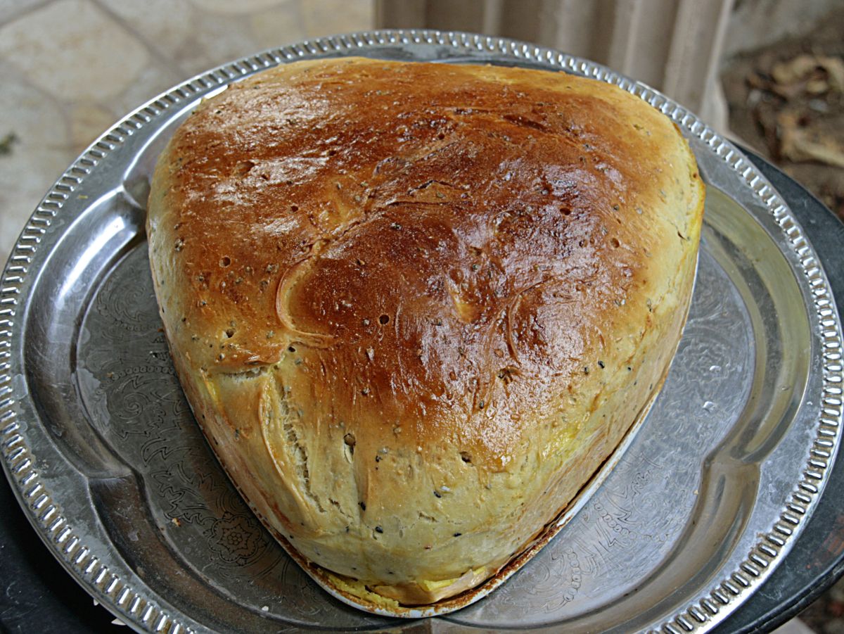 Das Eigelb vorsichtig mit einem Pinsel auf den Teig streichen und mit etwas Sesam bestreuen. Im vorgeheizten Ofen bei 230 °C ca. 30-40 Minuten backen, bis die Oberseite goldgelb ist. Auf einem Kuchengitter auskühlen lassen.
