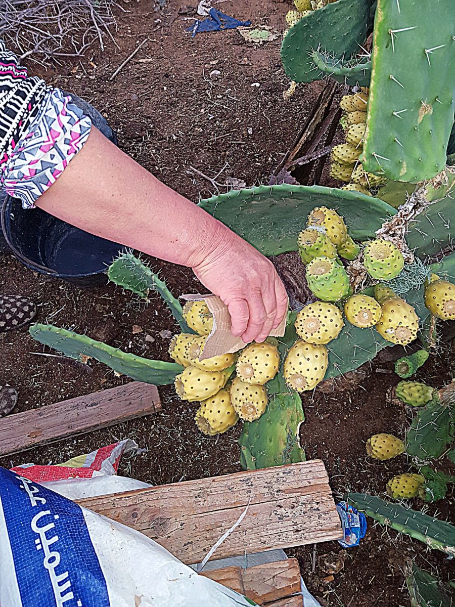 Die groben Stacheln sind schon entfernt, wenn man sie kauft, aber die dünnen Plastiktüten halten die haarfeinen Stacheln mit den Widerhaken nicht ab. Deshalb nehm ich immer eine feste Kunststofftasche mit, wenn ich beim Straßenhändler einkaufe. Ein Eimer kostet 1,5 Dinar, also 50 Cent. Sehr preiswerte Gesundheit also. Dann heißt es, dicke Gartenhandschuhe anziehen, an den Enden jeweils eine Scheibe abschneiden, die Schale der Länge nach aufschlitzen und die Frucht quasi auswickeln. (siehe: wie man Kaktusfeigen schält)