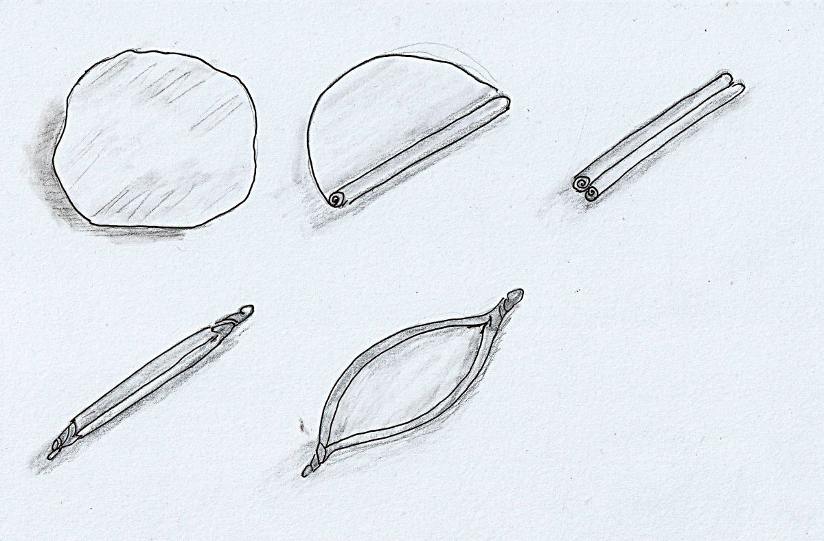 Die Kugeln auf Backpapier zu Kreisen auswalzen. Von zwei Seiten bis zur Mitte aufrollen und die Enden verzwirbeln. Dann die Rollen wieder vorsichtig nach außen rollen, bis der Teigling etwa die Form eines Bootes hat.