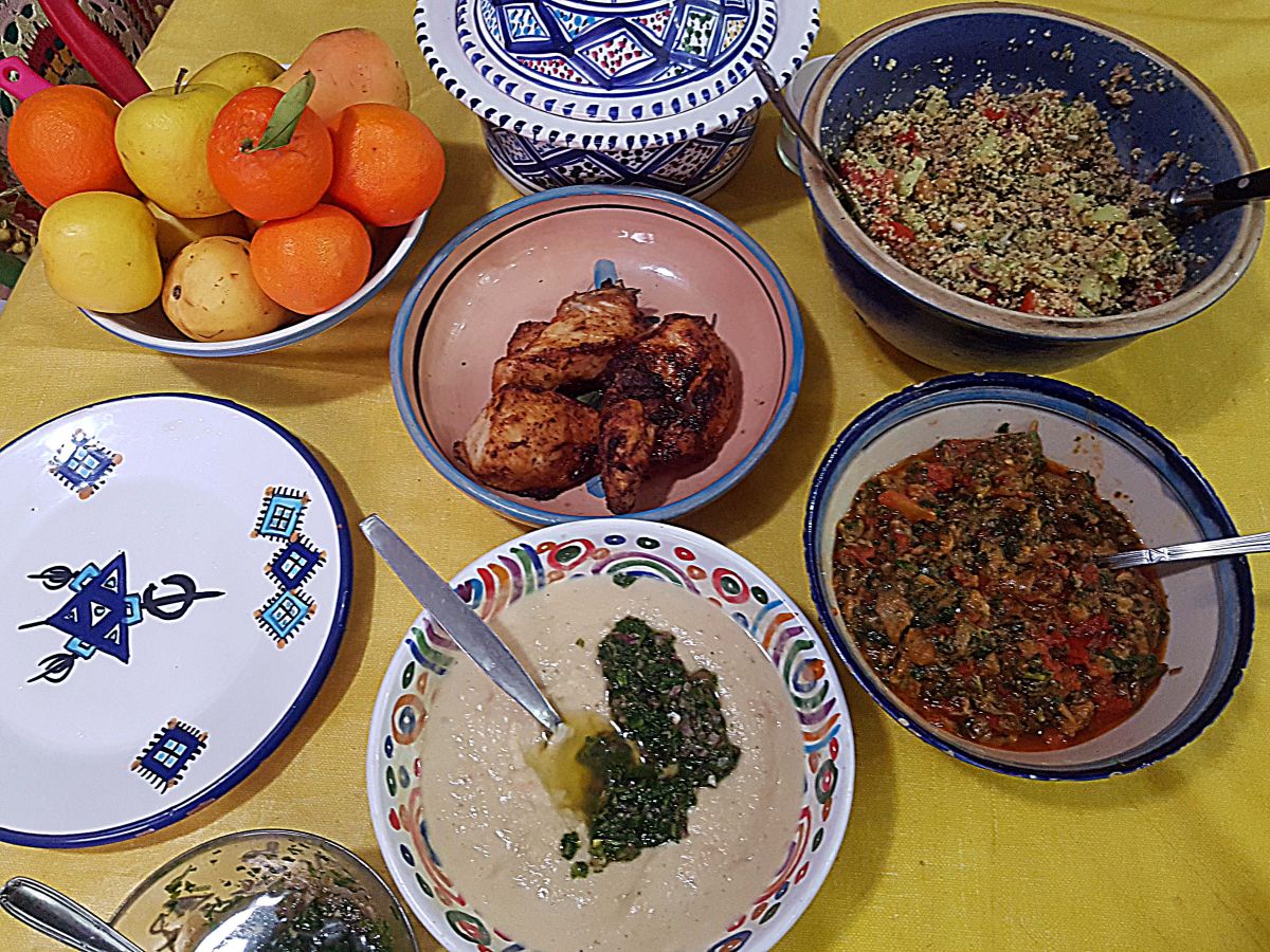 Als erstes den Couscous mit Rosinen, geschälten Mandeln und vorgekochten Kichererbsen gemacht – so lecker (aber die Kinder mögen das nicht) – und daraus einen Salat gemacht. Dann marokkanisches Zaalouk, Auberginen mit Tomaten-Pürree und noch ein Fava Santorini ohne die echten Bohnen aus Santorin, sondern aus Lubia und gelben Linsen, dazu eine Mischung aus Zwiebeln, Kapern und Petersilie, die selbst Kapern-Hassern schmeckt. Dazu gabs knusprige griechische Koulouri, Sesambrötchen