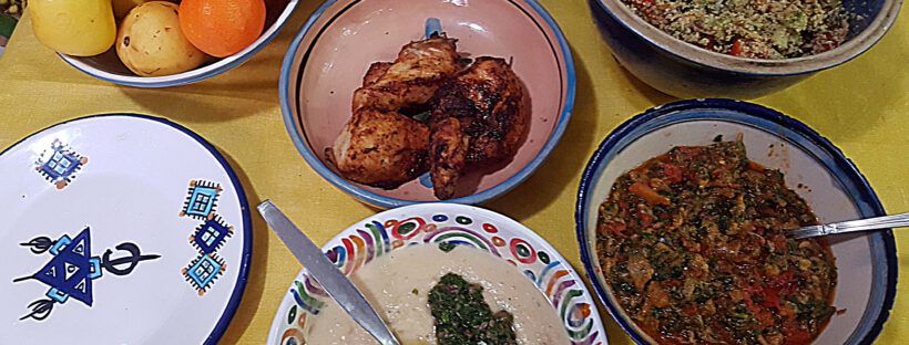 Als erstes den Couscous mit Rosinen, geschälten Mandeln und vorgekochten Kichererbsen gemacht – so lecker (aber die Kinder mögen das nicht) – und daraus einen Salat gemacht. Dann marokkanisches Zaalouk, Auberginen mit Tomaten-Pürree und noch ein Fava Santorini ohne die echten Bohnen aus Santorin, sondern aus Lubia und gelben Linsen, dazu eine Mischung aus Zwiebeln, Kapern und Petersilie, die selbst Kapern-Hassern schmeckt. Dazu gabs knusprige griechische Koulouri, Sesambrötchen