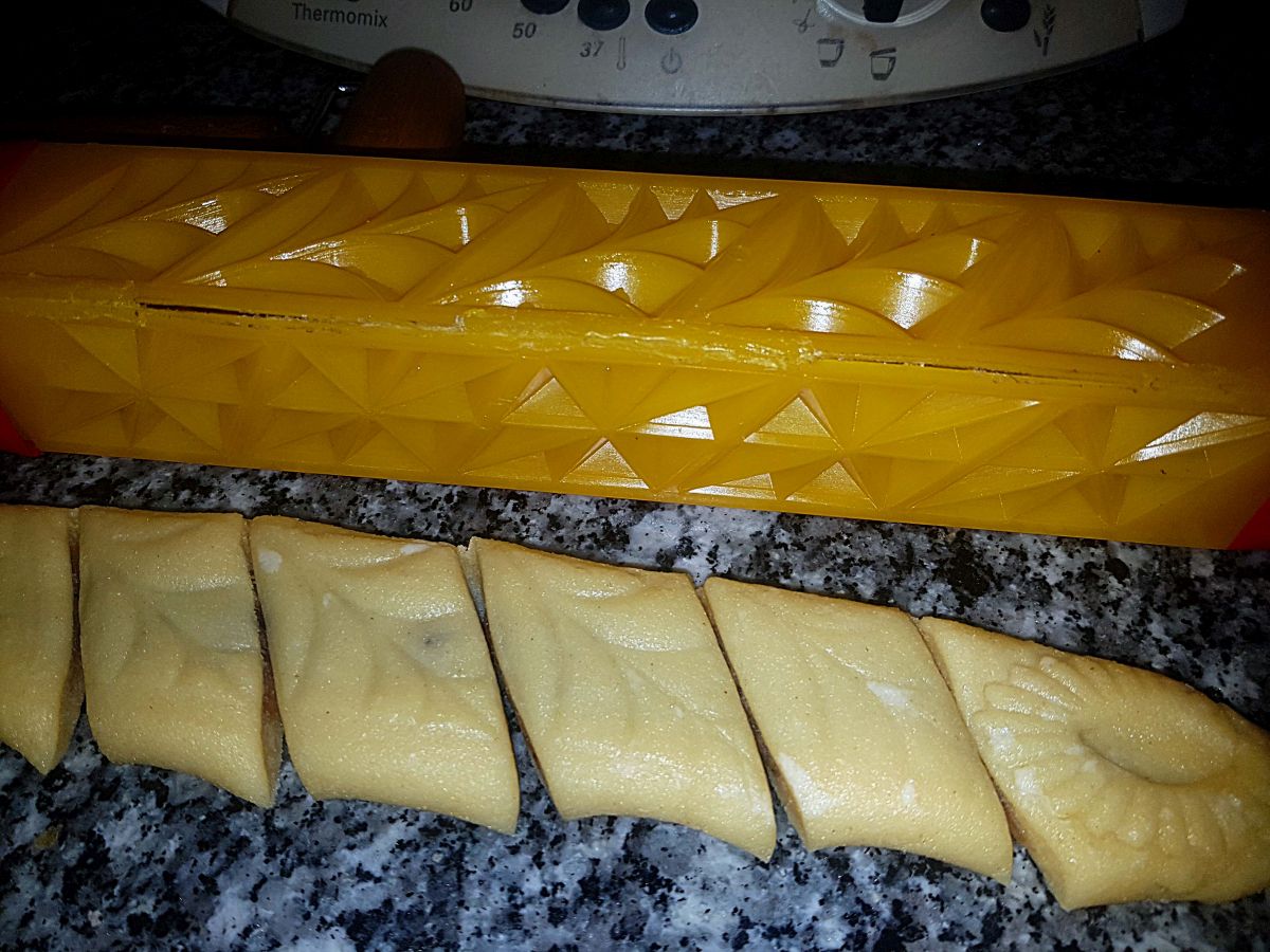 Nicht zu flach, denn jetzt wird noch der Stempel aufgedrückt bzw. mit Gabeln ein Muster eingedrückt. Die Kekse in Rauten schneiden und auf einem mit Backpapier ausgelegten Blech im vorgeheizten Ofen bei