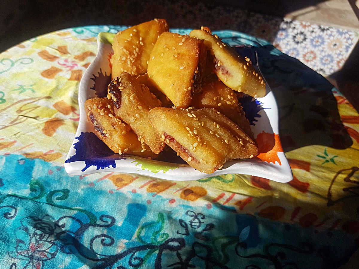 Maqruud sind einfacher herzustellen als man meinen möchte, obwohl es raffiniertere Rezepte gibt als dieses (wo z.B. erst das Wasser für den Teig aromatisiert wird usw). Dattelpaste kann man fertig kaufen; in Deutschland in türkischen oder arabischen Läden. Ich hab meine natürlich selbst gemacht, aber das schon letzte Woche, so dass ich jetzt keinerlei Stress mehr hatte.