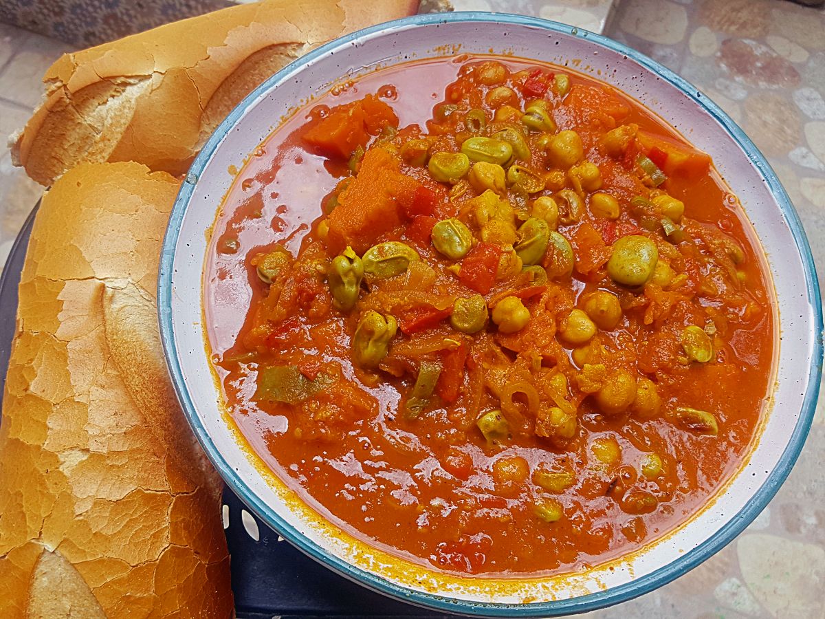 Da ich eh nicht so auf dicke Bohnen stehe, hab ich davon nur ganz wenige genommen und würde sie nächstes Mal ganz weglassen. Denn mit Kürbis und Kichererbsen allein schmeckt diese „Sauce“, diese tunesische Marga toll. Um die Kinder übers Gemüse hinweg zu trösten, habe ich noch ein Stück Huhn mitgekocht. Das macht sich gut, ist aber nicht zwingend nötig. Auch rein vegan schmeckt dieses Gericht sehr lecker!