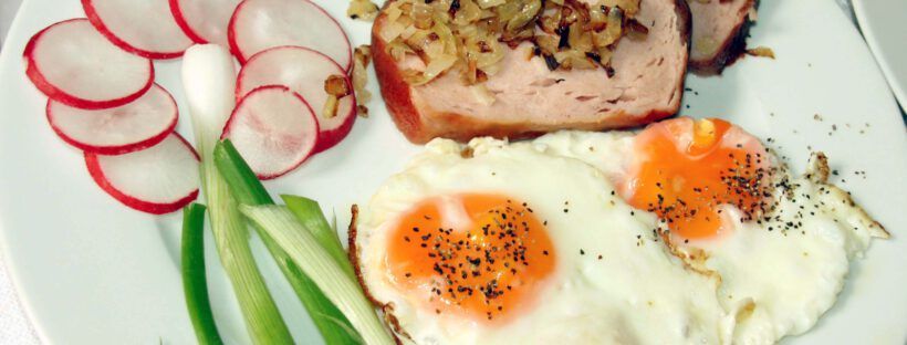 Braucht jemand eine Anleitung dazu? Spiegeleier mit Leberkäse oder mit Bacon und Tomate. Schmeckt eigentlich immer und macht vor allem lange satt. für 2-3 Portionen 1 kleine Aluschale mit Leberkäse zum Selberbacken 4-6 Eier Radieschen in Scheiben Lauchzwiebeln 1 große Zwiebeln, klein gehackt Den Leberkäse nach Anleitung ca 30-45 Min im Ofen backen. In der … Weiterlesen Low Carb Frühstück 1