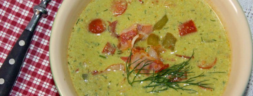 Erbsensuppe mit Bacon, Gurken und Debreciner Low Carb