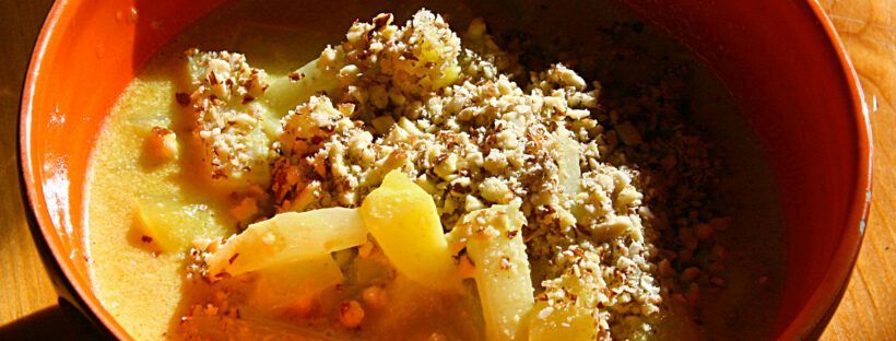Eine glutenfreie, sättigende Mahlzeit in leckerer Sauce. für 2 150 g Buchweizen 1 EL Maisgrieß 3-5 EL Sesam 100 ml Wasser 100 ml Kokosmilch 1 Tl grünes Masalum 1 Handvoll frische Kräuter, fein gehackt Salz Buchweizen waschen, dann nach Vorschrift (i.d.R. 1 Teil Buchweizen, 2 Teile Wasser) aufkochen und zugedeckt 15 Minuten ausquellen lassen. Abkühlen. … Weiterlesen Buchweizenbällchen in Kräutersauce vegan