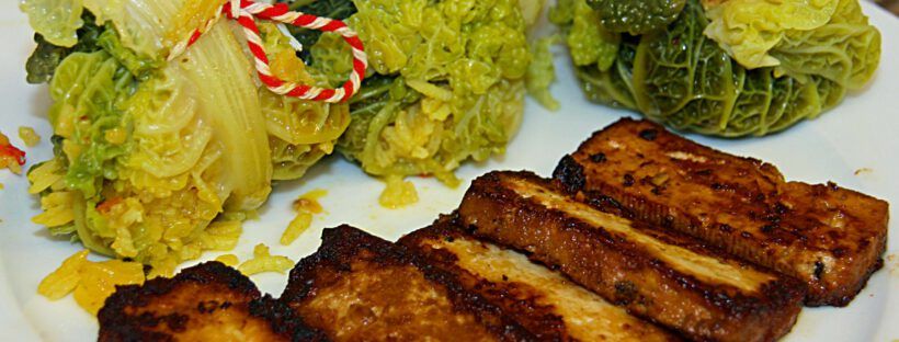 Reis lecker verpackt. Dazu gibts Mandeltofu, in Sesamöl gebraten, mit Sojasoße (Tamari) abgelöscht. für 2 1 kleiner Wirsingkopf, die äußeren Blätter 1 Tasse Basmatireis 1 Karotte, geschält in kleinen Würfeln 1 kleine rote Paprika, in kleinen Würfeln 1 kleine Schalotte oder Zwiebel, fein gehackt 1 TL gelbes und rotes Masalum 1 Achtel Salzzitrone ,die Schale … Weiterlesen Wirsing-Reis-Päckchen vegan