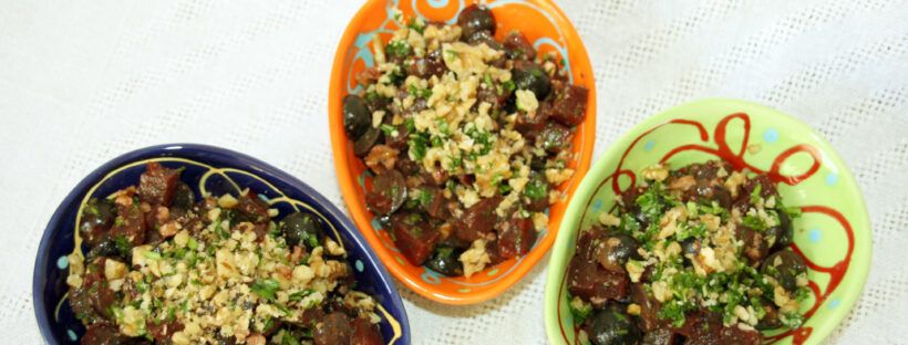 Die süßen Trauben sind natürlich nicht ganz Low Carb, aber wenn man sonst keine Kohlehydrate dabei hat, geht es trotzdem. 1 Packung gekochte Rote Bete (3-5 Stück) 200 - 250 g blaue Trauben 1 Handvoll süße Himbeern 1 Handvoll Walnüsse, gehackt 3 El gehackte Petersilie Für das Dressing: 3-4 EL dunkler Balsamico oder Rotweinessig 2-3 … Weiterlesen Rote Bete-Walnuss-Trauben-Salat