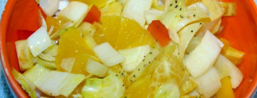 Der leicht bittere Chicoree läßt sich besonders gut mit fruchtigen Zutaten kombinieren wie Orangen, Äpfeln, Mango oder anderen Früchten. Zusammen mit dem mild-süßen Dressing vergißt man fast, dass es ein Salat ist. 1-2 Chicoree 1 Bio-Orange halbe rote Gemüsepaprika, gewürfelt Salz, Pfeffer 1 TL Xucker 1 EL Rapsöl 1 EL Lemon Balsam 1 TL Pfirsich … Weiterlesen Chicoree mit Orangen Low Carb