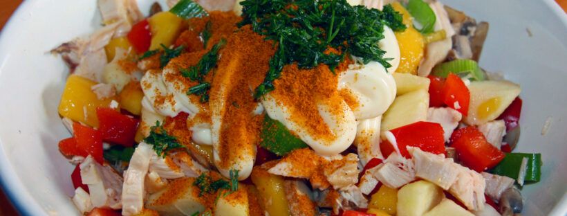 Ideale Restverwertung vom Sonntagsbrathähnchen. Aber auch mit frisch gebratenem Hühnerfleisch ein leichtes Abendessen. Wer es ganz streng hält mit Low Carb, muß die Mango weglassen. Wär aber schad! für 2 Personen 1 Stück Hähnchenfleisch gebraten (ca. 1/4 Hähnchen), in kleine Würfel 1/2 Mango, geschält in Stücken 1 kleiner Apfel, geschält, in Stücken 5 Champignons, in … Weiterlesen Hähnchen-Curry-Salat Low Carb