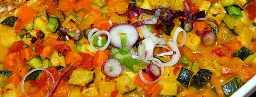 Eine schöne bunte Beilage aus der Ayurvedaküche die man mild oder pikant abschmecken kann. für 2-3 3 größere Karotten, gewürfelt je 1 halbe rote und gelbe Paprika, gewürfelt 1 Zucchino, gewürfelt 1 Tomate, gewürfelt 300 ml Reismilch, Hafermilch o. ä. 1 EL Kichererbsenmehl 2 TL rotes Masalum 1 Lauchzwiebel, in Ringe geschnitten Salz, Öl Den … Weiterlesen Überbackenes Gemüse – Low Carb, vegan