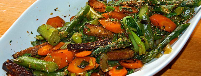 So ein schnelles leichtes Asia-Essen geht immer! für 2: 1 Paket Tofu (Mandeltofu oder ähnl.), in Stangen geschnitten 4 Karotten, geschält in schräge dicke Scheiben 400 g Pakchoi, die kleinen Blätter ganz lassen, die großen längs halbieren 4 Lauchzwiebel, in schräge Ringe 1 rote Chili, eventuell die Kerne entfernen, in feine Ringe schneiden 20 g … Weiterlesen Asia Pfanne mit gebratenem Tofu und Sesam – vegan , Low Carb
