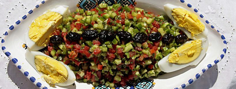 Typischerweise wird der Salat mit Paprika hergestellt und mit Minze gewürzt. Doch hat die Köchin hier Variationsmöglichkeiten: gerne geselllt sich auch Eissalat oder etwas Fenchel dazu, wird Zwiebel weggelassen oder frischer Koriander statt Minze hinzugefügt, je nach den Vorlieben der Familie. Zutaten 4 Tomaten, entkernt 1 größere Salatgurke, entkernt 1 Zwiebeln oder Lauchzwiebel, in dünne … Weiterlesen Tunesischer Salat – Slata Tunsia